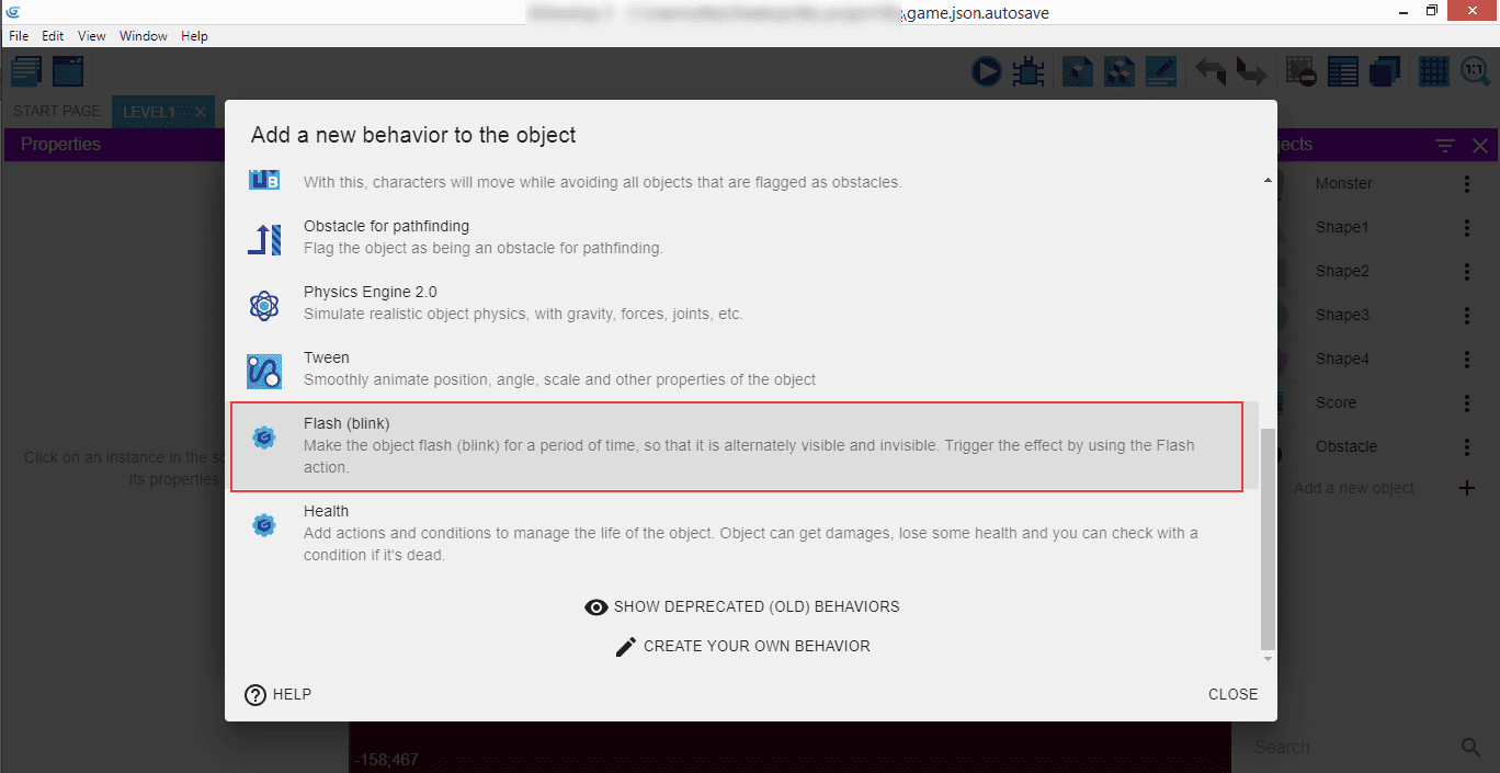 The "Half period" means the time when the object is invisible, and we're going to set it to 0,1 seconds. Below that, you can see the "Health" behavior we entered previously. Click "Apply" to have them saved.